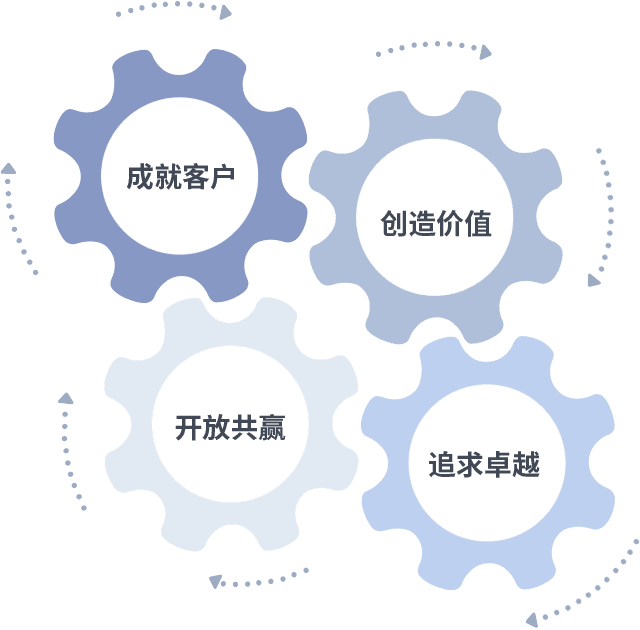 成就客户是一切决策的出发点,,,创造价值是衡量所有工作的标准,,,追求卓越是我们做事做人的态度,,开放共赢是我们的格局也是最终的结果。。价值观的齿轮环环相扣,,,,推动着组织里的每个人不断向前。。